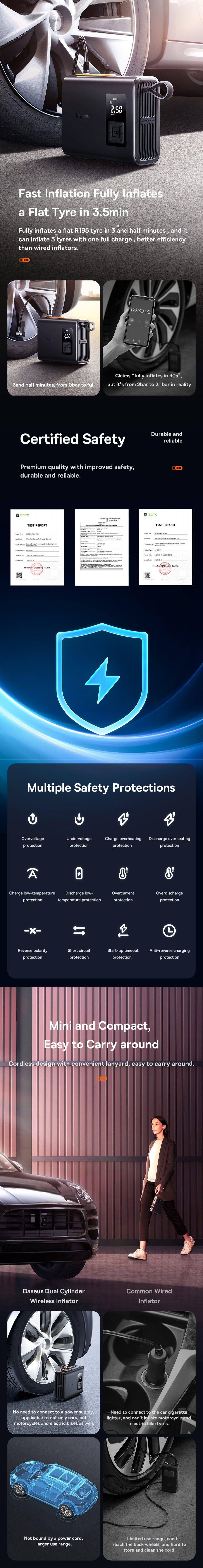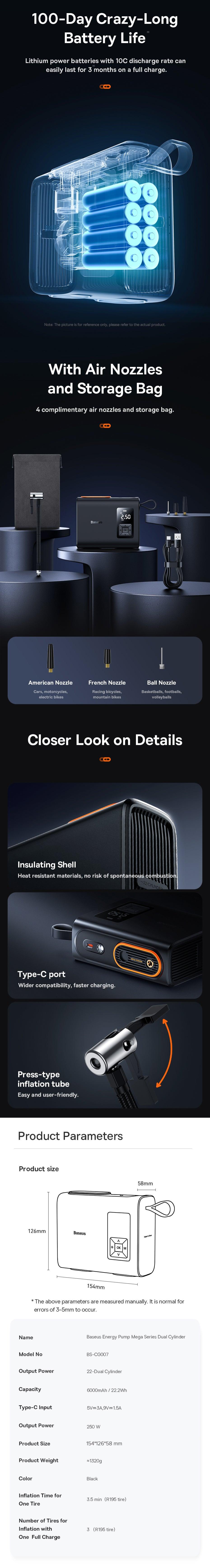 The Baseus Mega Energy Pump is a versatile and efficient wireless compressor for quick tire inflation. Its double die-cast alloy cylinder and 6000mAh battery make it powerful, allowing it to inflate a tire from 0 Bar to full in just 3.5 minutes, three times faster than typical compressors. Safety features include over-voltage and overheating protection, real-time pressure monitoring, and automatic shut-off when the tire is filled. This compressor is cable-free, making it easy to use, and it comes with various nozzles for different applications. Additionally, it features an emergency LED light with three modes for added convenience and safety during nighttime use.