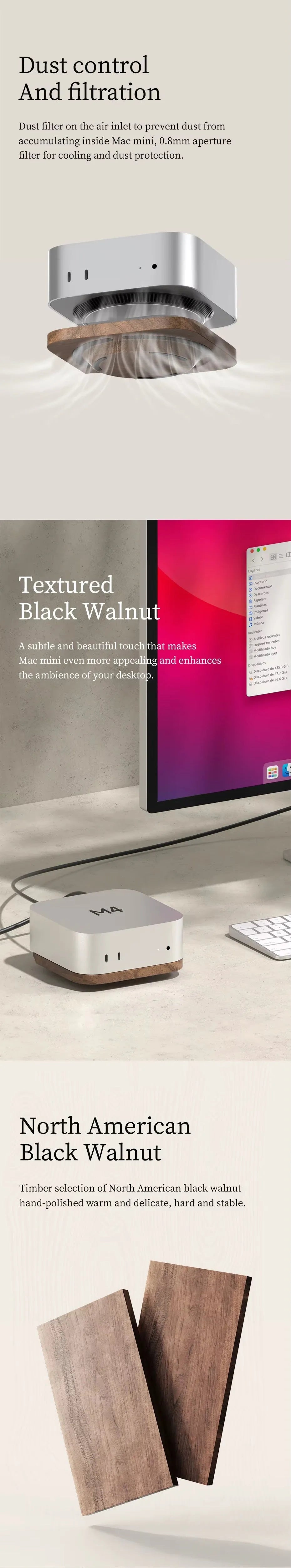 Textured Black Walnut: A refined, elegant accent that enhances the Mac mini’s appeal and elevates the atmosphere of your workspace.