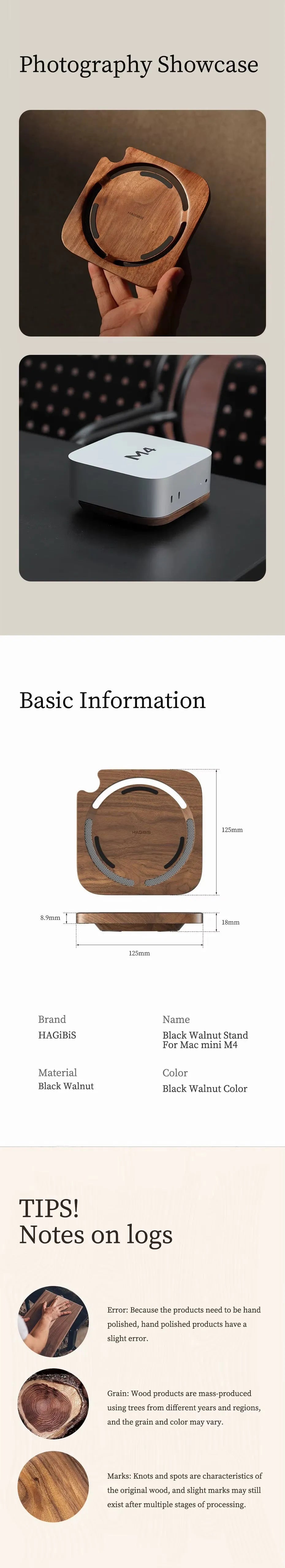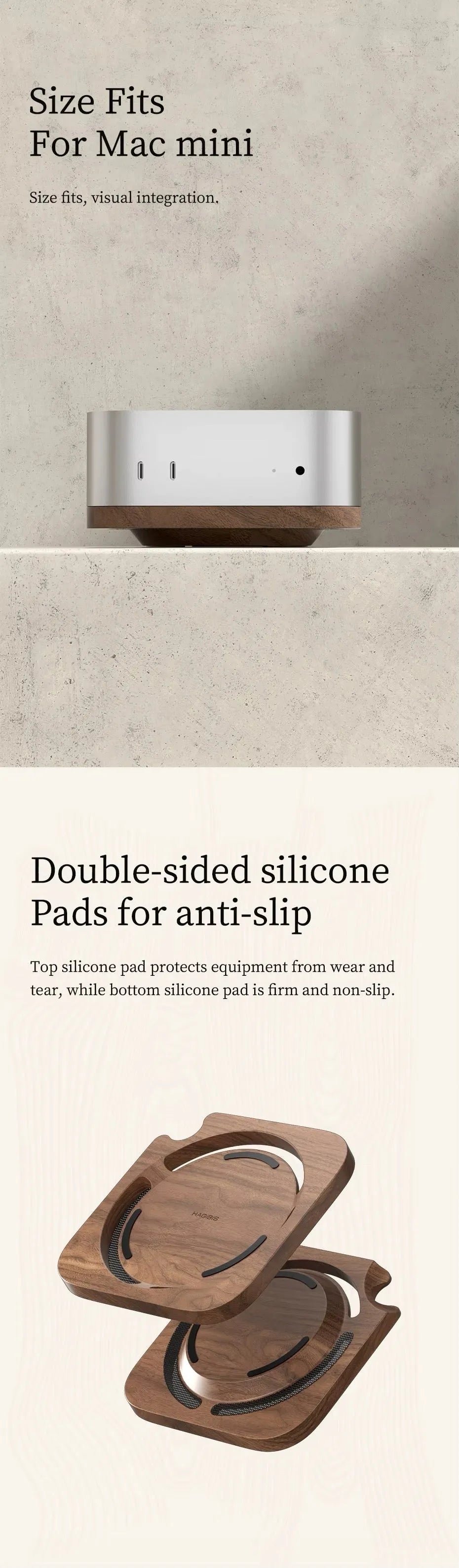 This solid wood stand, crafted from textured black walnut, is designed for the Mac mini M4. It features a ventilated base for efficient heat dissipation and pre-drilled holes for convenient power button access. The elegant walnut finish adds a refined aesthetic, enhancing your desktop environment. Double-sided silicone pads offer protection and stability— the top pad prevents wear on your device, while the bottom pad ensures the stand stays securely in place. Thoughtfully designed for both function and style, this stand elevates the look and usability of your Mac mini setup.