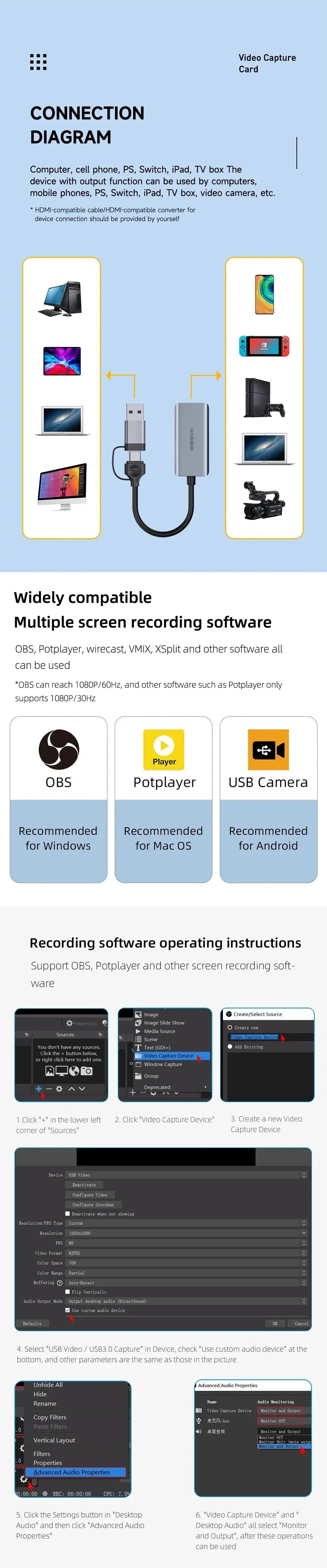 True USB3.0 1080P 60Hz Video Recording: The Hagibis video capture card supports up to 4K@60Hz input with a maximum output resolution of 1920x1080 @ 60Hz. It delivers smooth 1080P 60fps recording and live streaming. Ideal for capturing, recording, editing, and transferring high-resolution 1080p @ 60fps gameplay using software like OBS, AMCap, Xsplit, VLC, and more. -