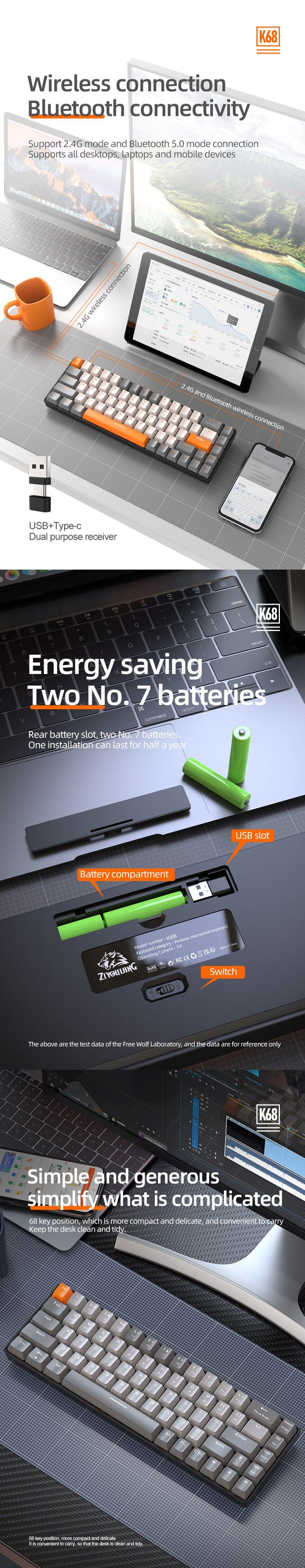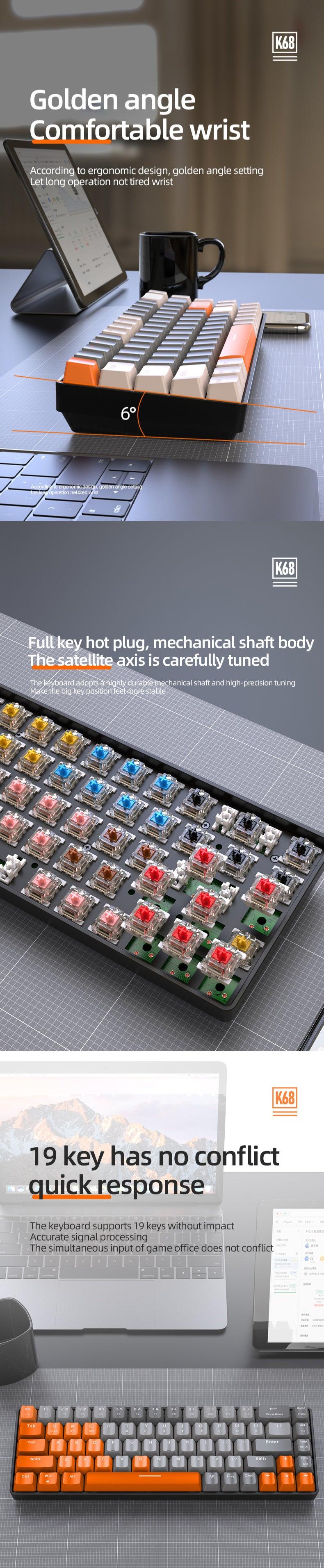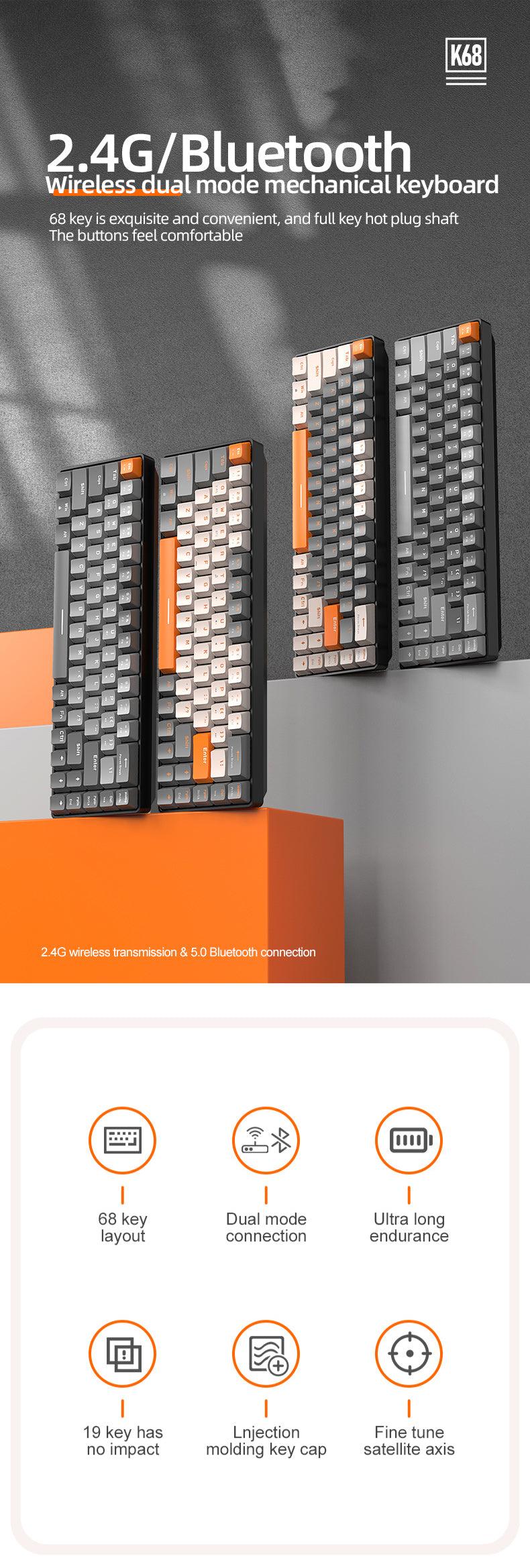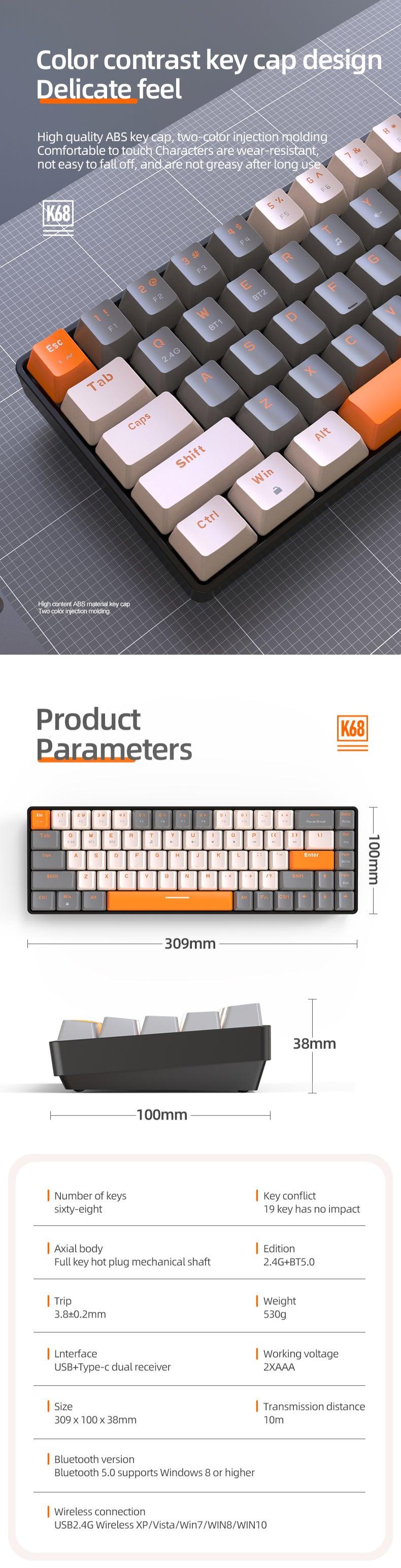 K68 Mechanical Gaming Wireless Bluetooth Keyboard 60% BT/2.4Ghz