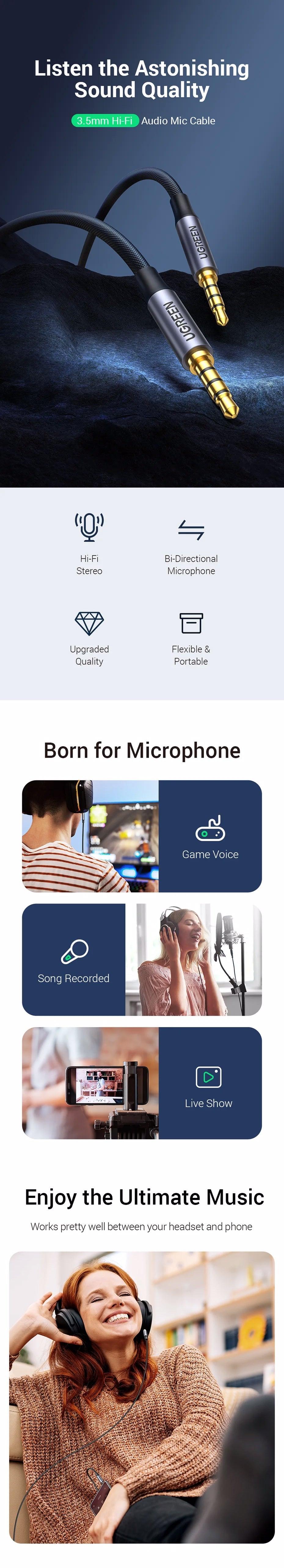 Ugreen 3.5mm Audio Aux Cable Mic 4-Pole TRRS Male to Male Stereo Jack