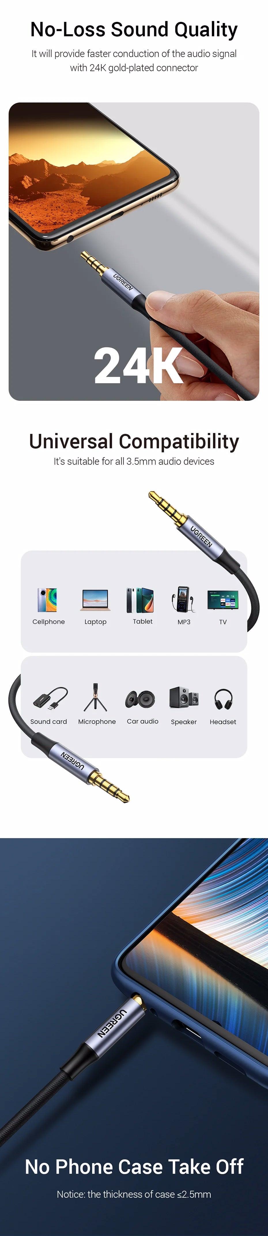 Functional 3.5mm Audio Cable: This Ugreen 4-Pole Mini Jack to Mini Jack Aux Cable facilitates both audio and microphone functionalities. It serves as an ideal substitute cable for headsets featuring microphone capabilities. Transmitting Hi-Fi stereo audio directly from the aux output (line-out) devices to aux input (line-in) devices, this male-to-male 3.5mm cable eliminates the need for audio converters. It effortlessly connects various devices such as laptops to speakers, phones to headphones, TVs to soundbars, and phones to car stereo systems.