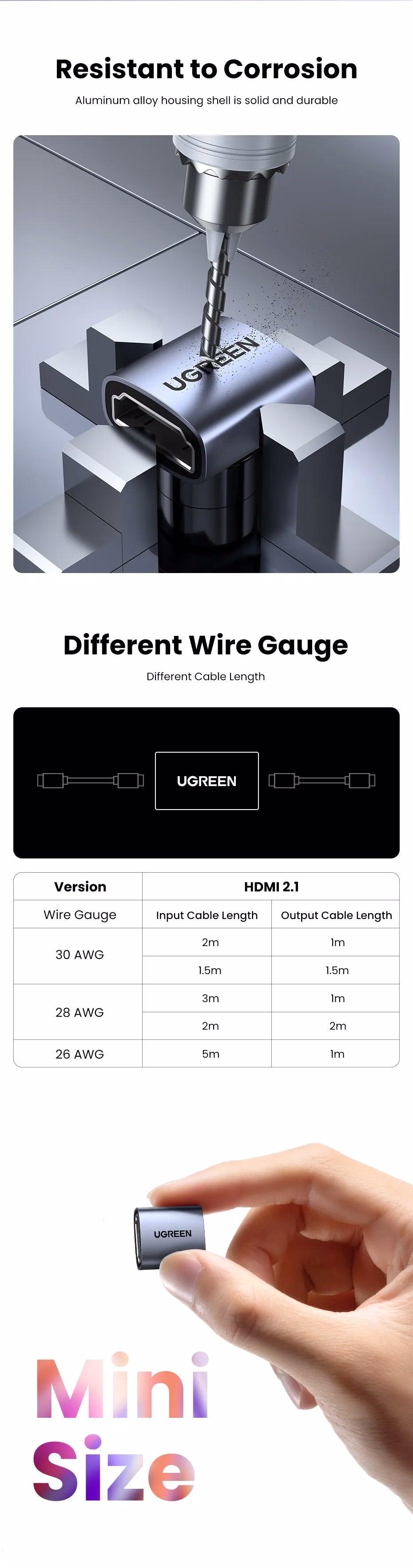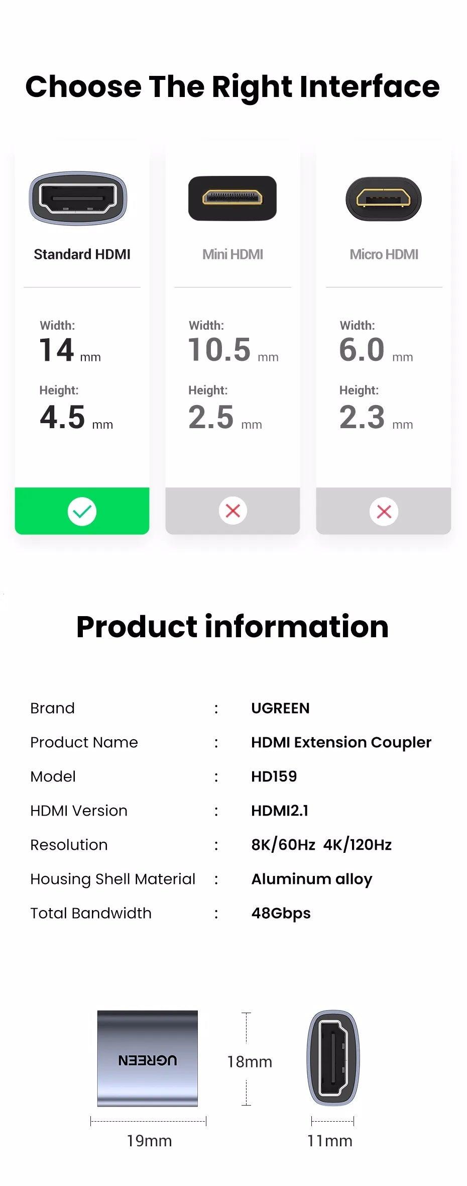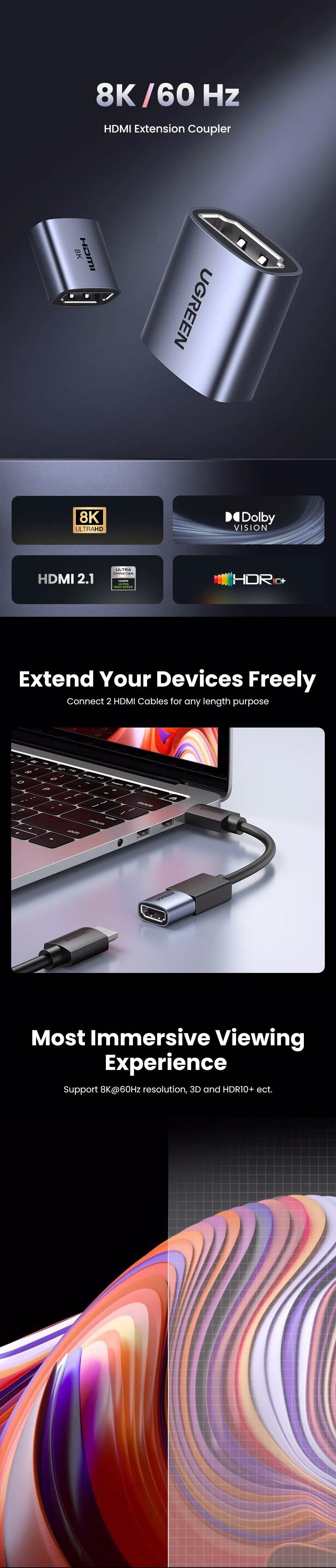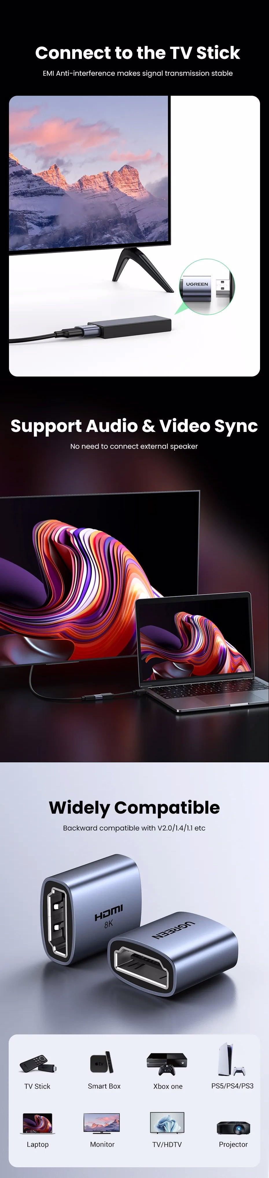 HDMI 2.1 Female to Female Coupler: The Ugreen HDMI 2.1 Female to Female Coupler serves as an extender, allowing you to connect two HDMI cables to extend the reachable distance. By using the HDMI Female to Female Adapter, you can easily adjust the distance between your TV stick and television, or between your game console and monitor, providing greater flexibility.