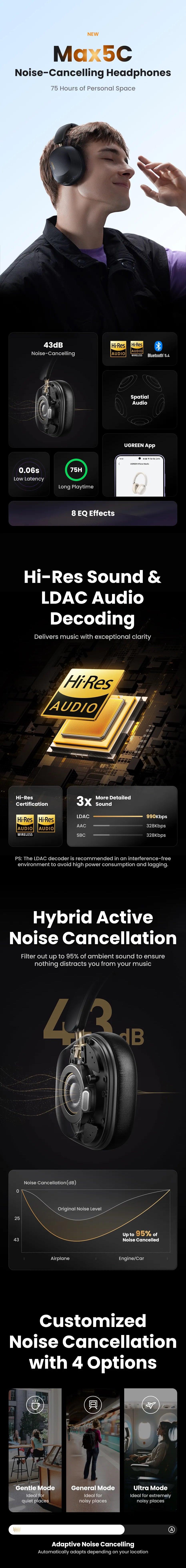 Ugreen HiTune Max5c ANC Wireless Bluetooth 5.4 Headphones Active Noise Cancellation