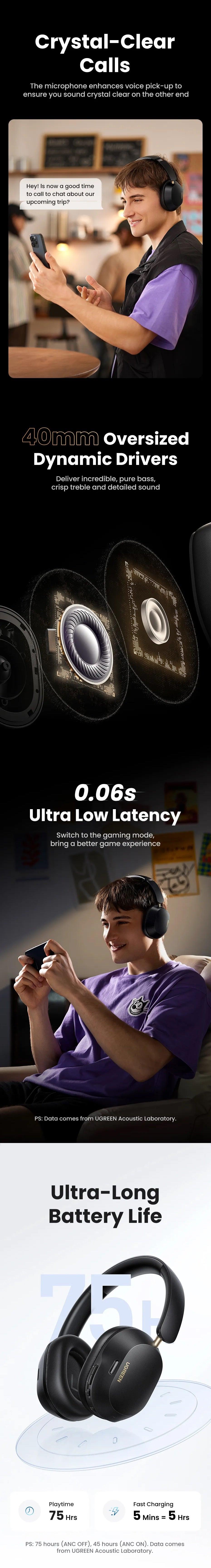 USB-C Fast Charging: Ugreen Bluetooth headphones reach a full charge in just 90 minutes. A mere 5 minutes of charging allows for 5 hours of uninterrupted music playback. Enjoy an impressive 75 hours of continuous battery life in standard music mode and 45 hours in noise reduction mode.